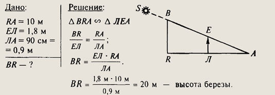В солнечный день длинна тени на земле от клки высотой 1,8м равняется 90см,а от березы 10см. Какая высота березы?