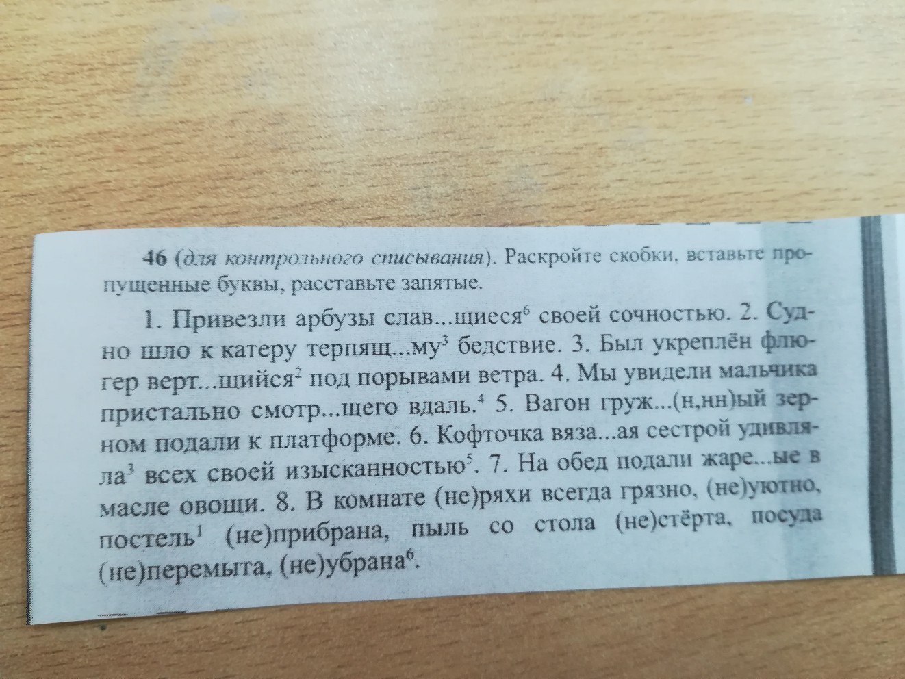 привезли арбузы, славившиеся своей сочностью. судно шло к катеру, терпящему бедствие. был укреплён флюгер, вертящийся под порывами ветра. мы увидели мальчика, пристально смотрящего вдаль. вагон, груженный зерном, подали к платформе. кофточка, вязанная сестрой, удивляла всех своей изысканностью. на обед подали, жаренные в масле овощи. в комнате неряхи всегда грязно, неуютно, постель не прибрана, пыль не стёрта, посуда не перемыта, не убрана. списывай с запятыми.