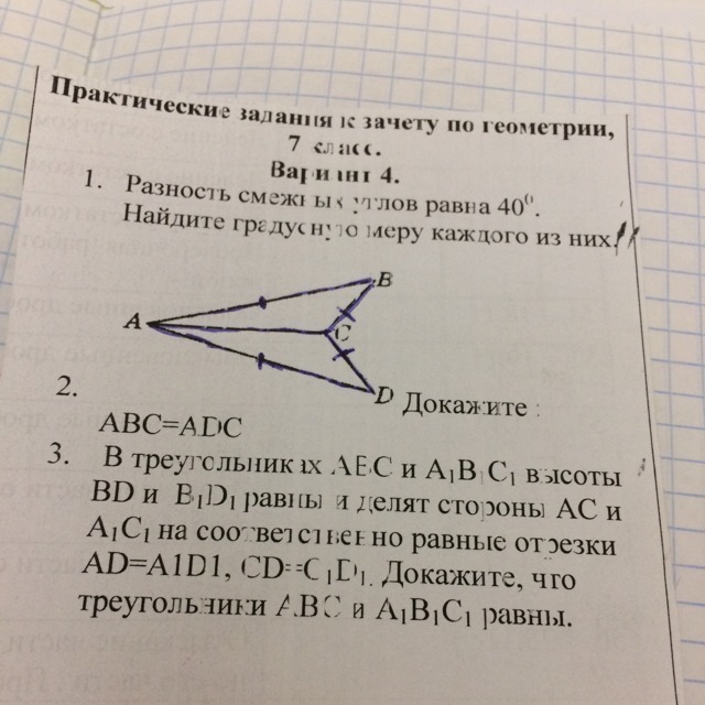3) BD=B1D1, AD=A1D1, CD=C1D1 ∠ADB=∠A1D1B1=∠BDC=∠B1D1C1 ( высота . треугольники равны по 1 признаку (2 стороны и угол между ними)