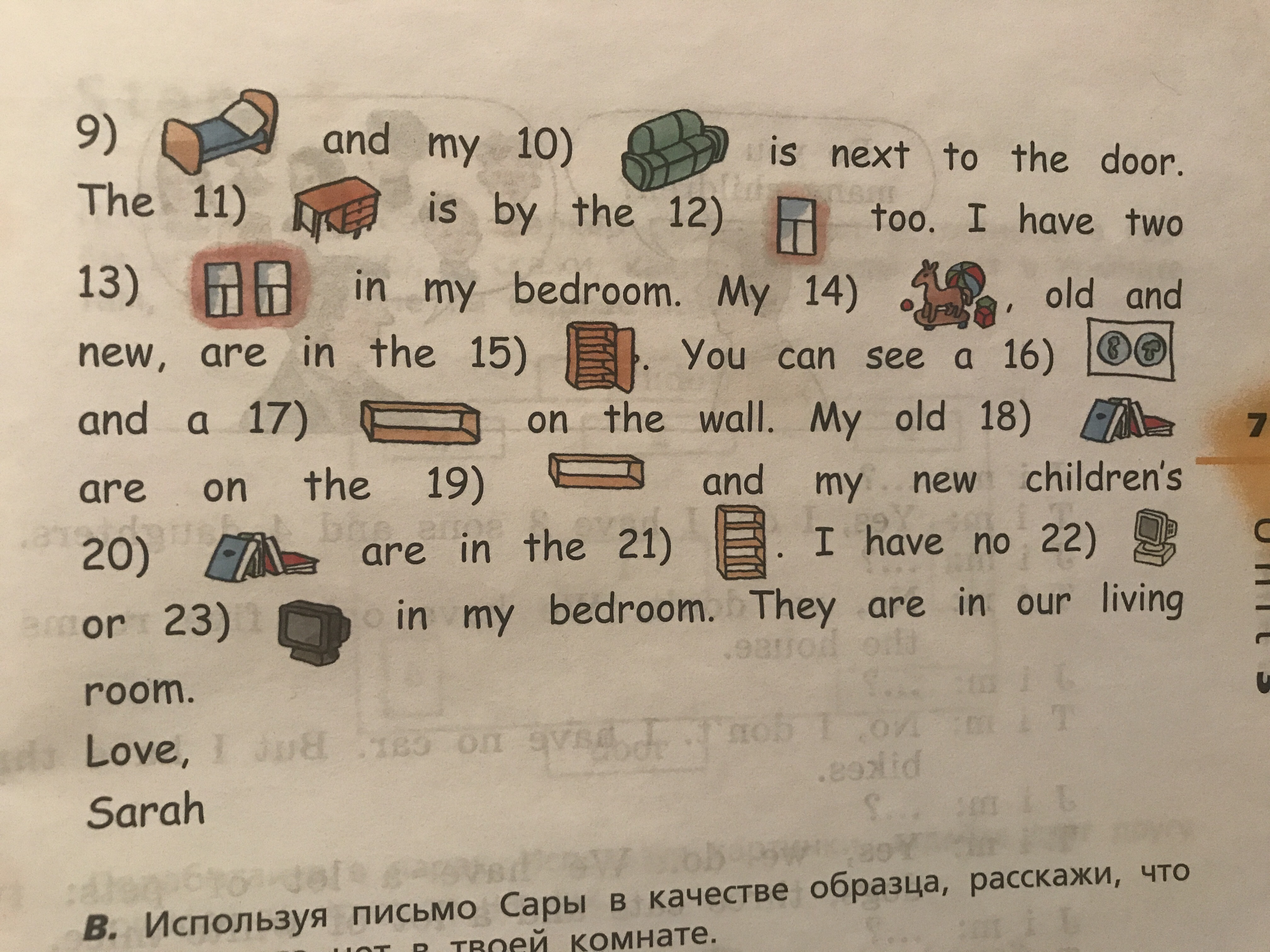 Мне понравилась наша новая квартира (Flat), и моя новая спальня. Это большая и современная комната. В моей комнате стоит кровать (Bed) и диван (Sofa). У меня есть не большой столик (Table) и у меня есть маленький рабочий столик( Desk) у окна ( Window) и недалёко от старого кресла (armchair) мой стол