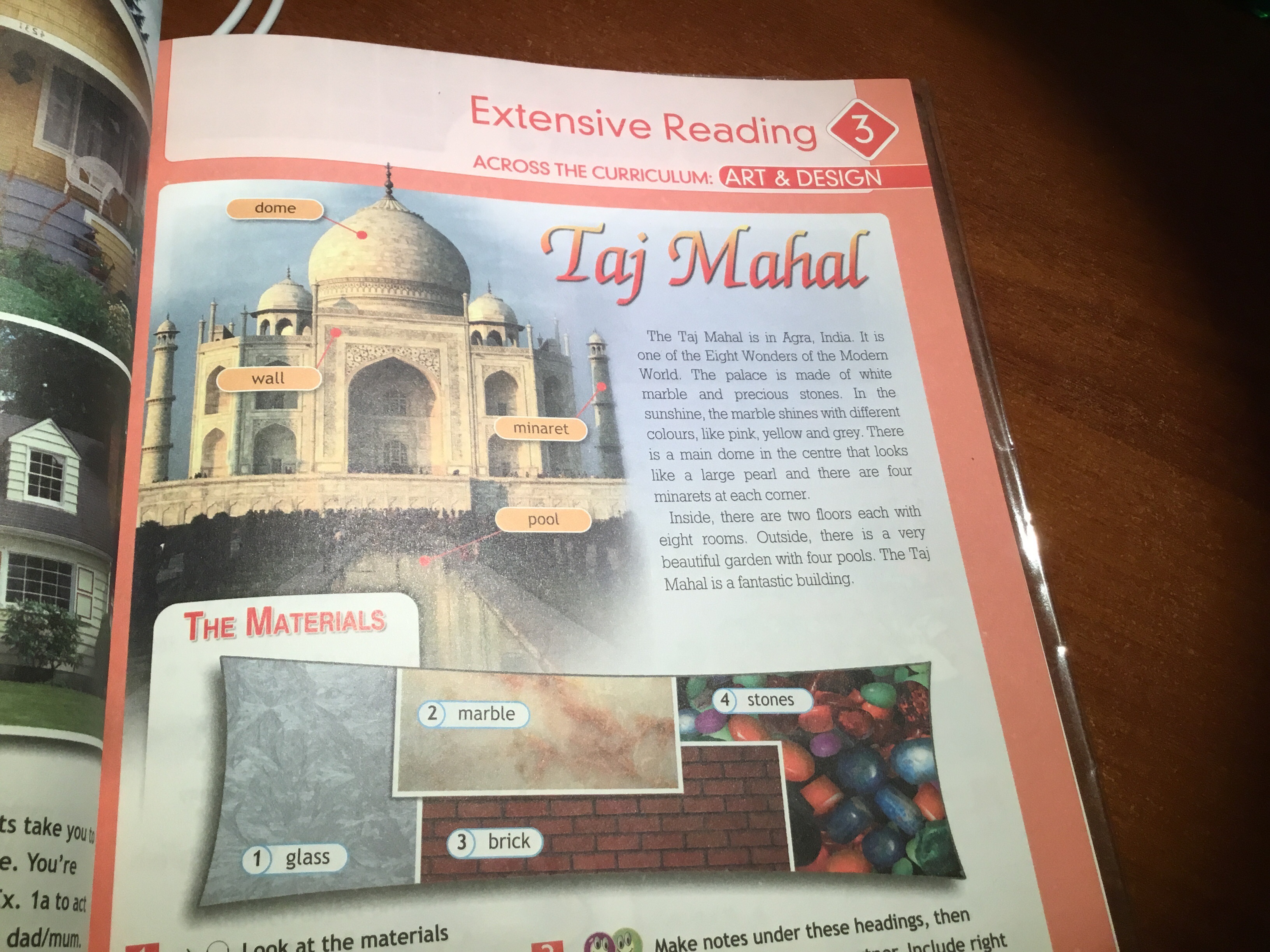 Тадж-Махал находится в Агре, Индия. Это одно из восьми чудес света. Дворец выполнен из белого мрамора и драгоценных камней. На солнце, мрамор переливается разными цветами, такими как, розовый, желтый и серый. Там есть главный купол в центре, который выглядит как большая жемчужина, и четыре минарета на каждом углу.