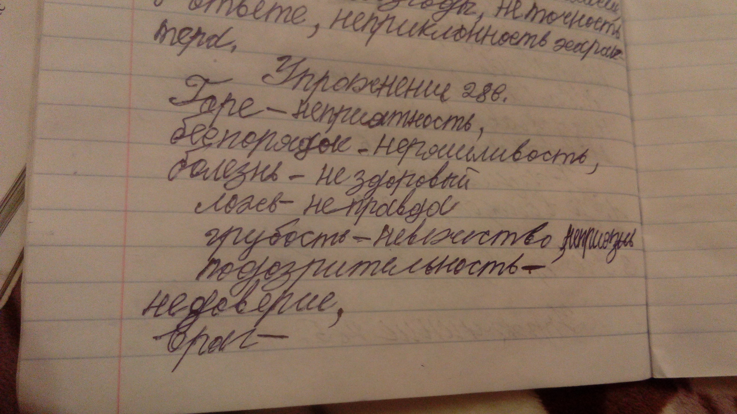 Антонимы к остальным словам: горе-радость, беспорядок-порядок, болезнь-здоровье, ложь-правда, грубость-вежливость, подозрительность-доверие