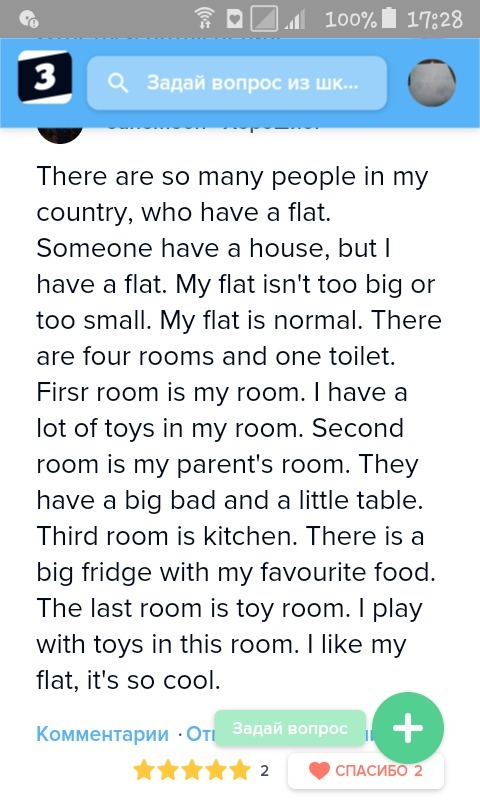 В моем городе живет очень много людей,у которых есть квартира.У кого-то есть дом но у меня квартира. Моя квартира не очень большая и не маленькая .Моя квартира средних размеров. В ней 4 комнаты и туалет .Первая комната моя. Вторая родительская комната .У них есть большая кровать и маленький стол.Третья комната кухня.Там большой хлолодилькик с моей любимой едой.Последня комната это игровая.Я играю в игрушки в этой комнате.Я люблю свою квартиру она очень крутая!