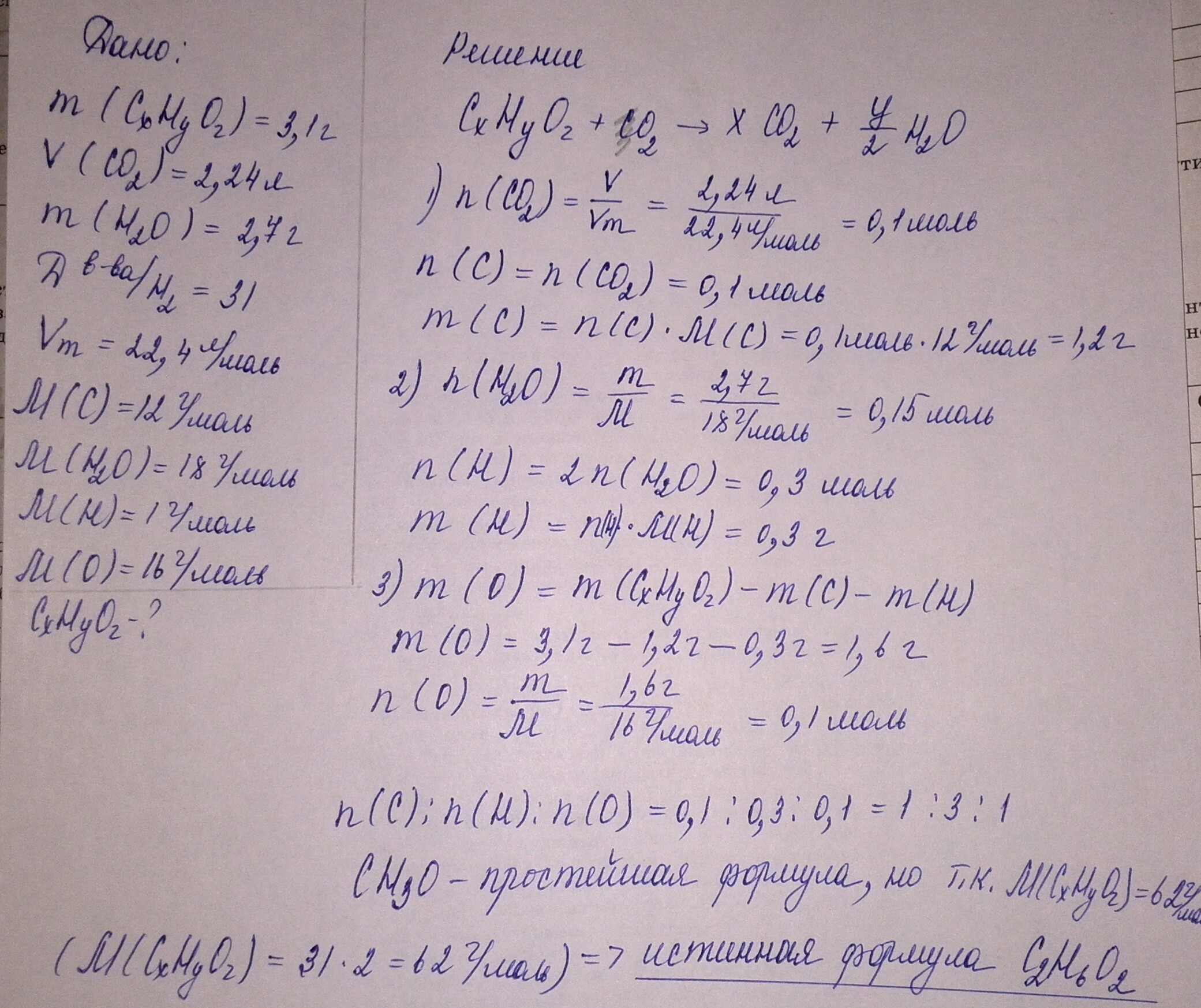 При полном сгорании 3,1г газообразного вещества образуется 2,24л СО2 (н.у) и 2,7г паров воды. Плотность вещества по водороду равна 31. Определите молекулярную формулу вещества.