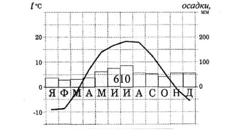 В июле самая высокая температура. 18 или 19 градусов цельсия. В марте самая низкая. -9 градусов цельсия. +19 градусов цельсия - (-9)= 10 градусов цельсия- годовая амплитуда. Больше всего осадков в июле, 85 примерно. Самая низкая в феарале, примерно