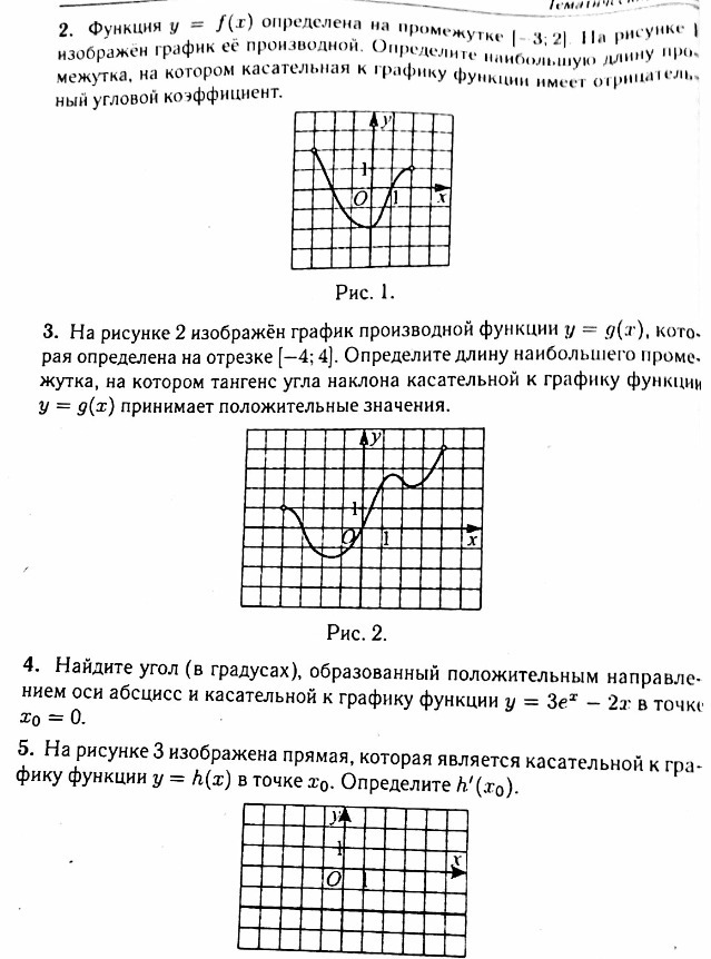 4) Найти производную: y'=3eˣ-2, найти её значение в точке х₀: y'(x₀)=3*1-2=1. Найденное значение есть тангенс угла наклона касательной в точке x₀ к положительному направлению оси Ох, то есть tgα=1, откуда сам угол α=45°