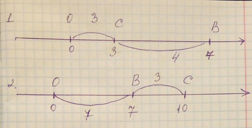 НА КООРДИНАТНОМ ЛУЧЕ ОТМЕТЬТЕ ТОЧКИ О(0),В(7), И ТОЧКУ С ТАК,ЧТО БЫ РАССТОЯНИЕ ВС БЫЛО РАВНО 3.СКОЛЬКО РЕШЕНИЙ ИМЕЕТ ЗАДАЧА?