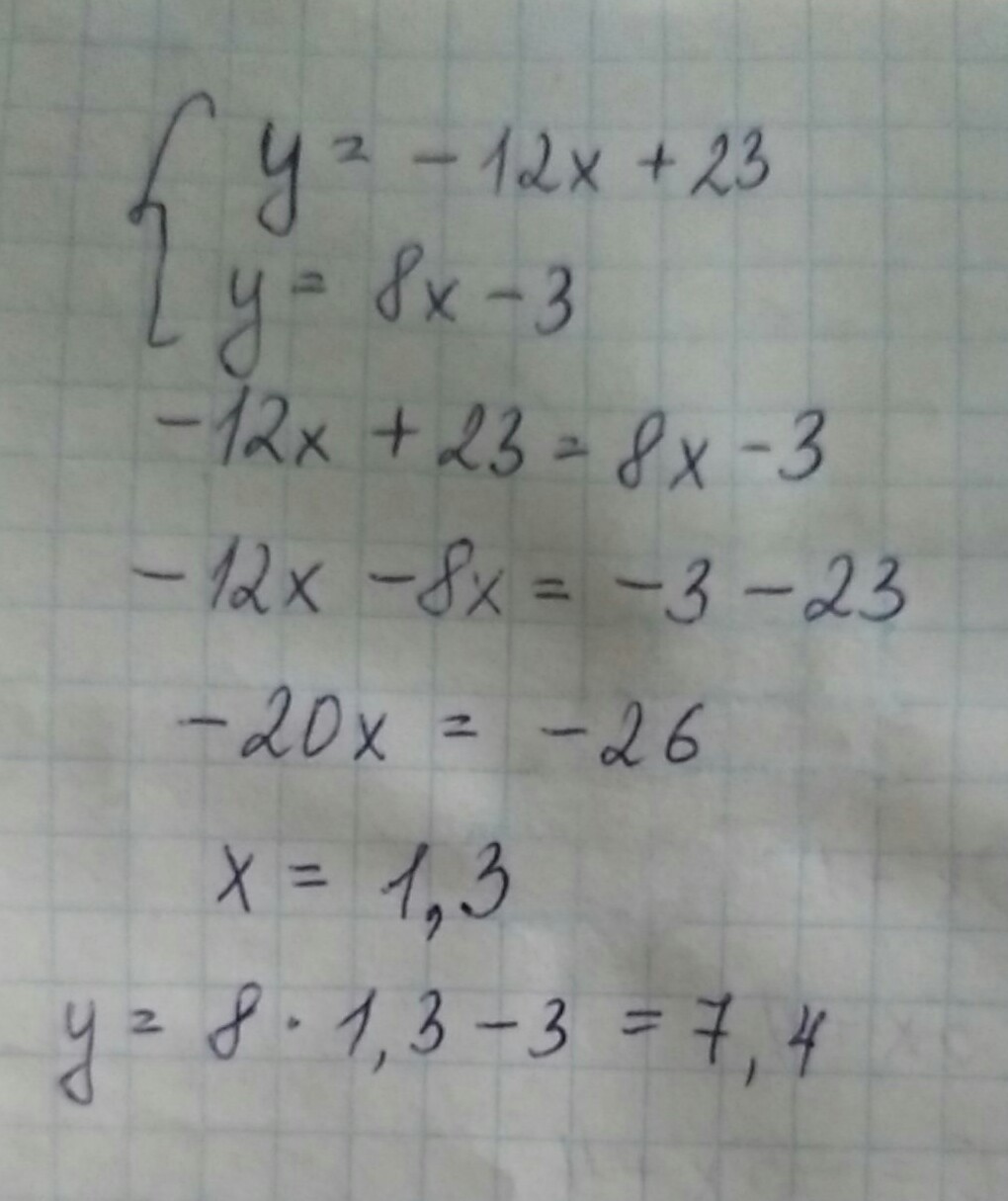 Не выполняя построения, найдите координаты точек пересечения графиков функций у=-12х+23 и у=8х-3.