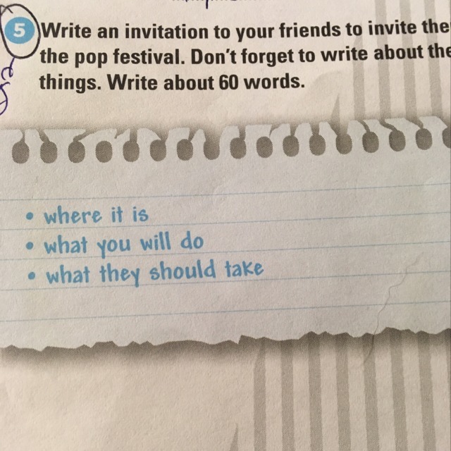 Write an invitation to your friends to invite them to the Pop Festival.don't forget to write about these things. write about 60 words.