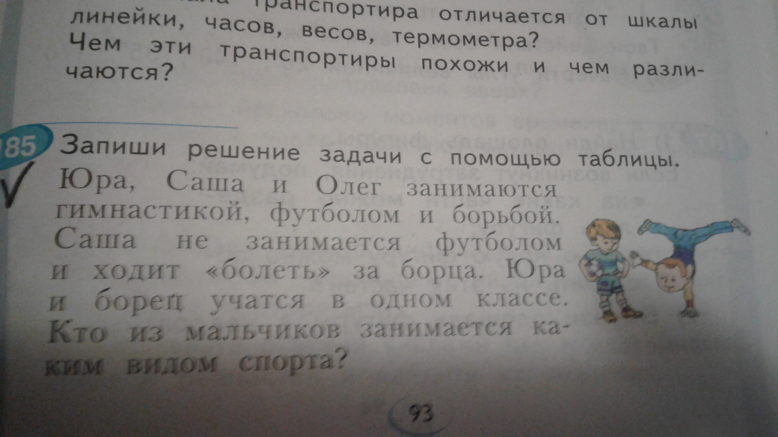 Фотка плохая.Ничего не видно на компьютере.Но я тебе помогу!Смотри-я не смогу написать таблицу в ответе потому что фотку тебе отправить не могу (у меня ее нет).Но смотри-если Саша не футболист,и ходит болеть за борца,значит он не борец.Саша занимается гимнастикой.