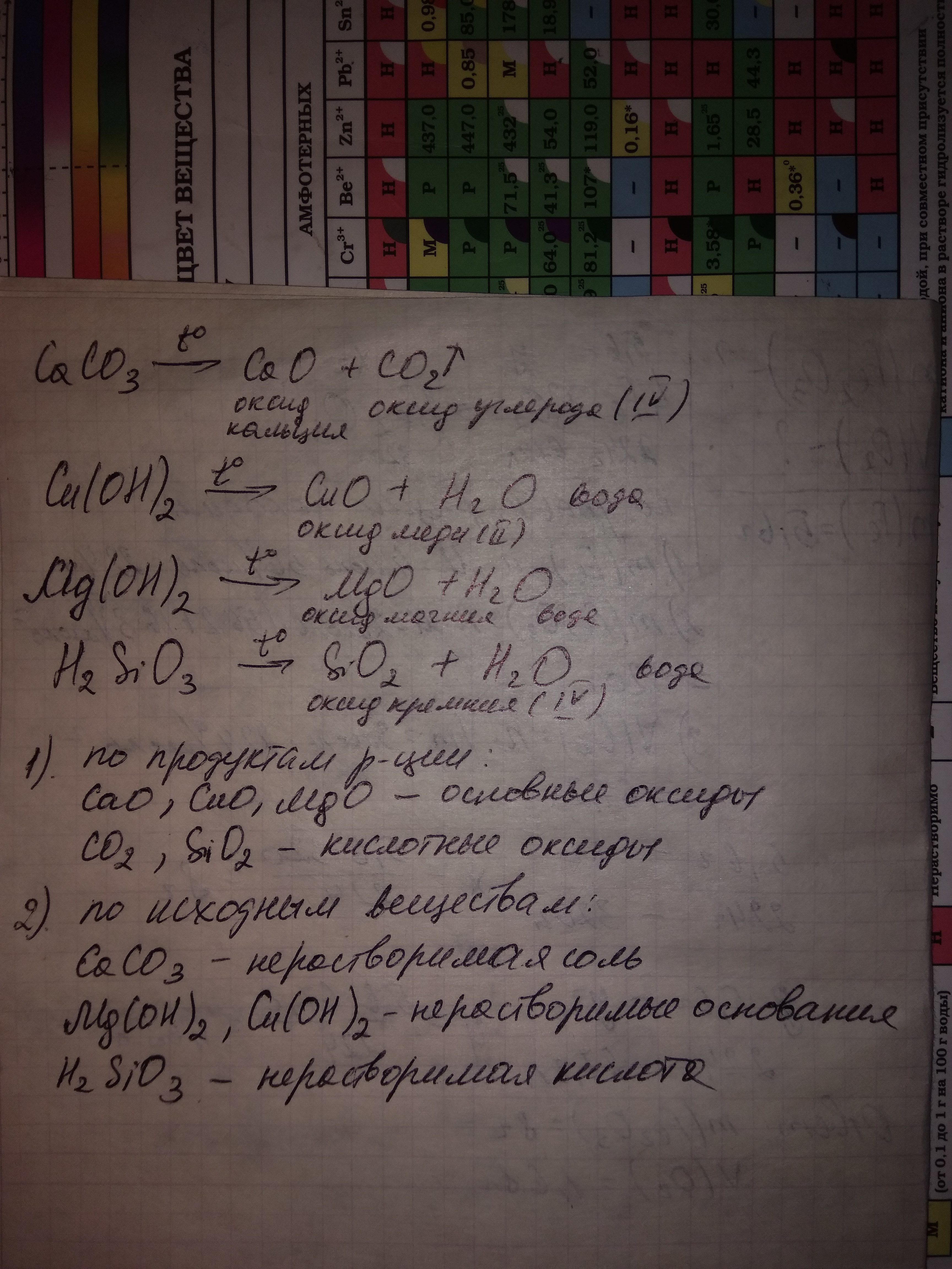 ОСТАВЬТЕ УРАВНЕНИЯ РЕАКЦИЙ РАЗЛОЖЕНИЯ СЛЕДУЮЩИХ ВЕЩЕСТВ:КАРБОНАТА КАЛЬЦИЯ,ГИДРОКСИДА МЕДИ(2),ГИДРОКСИДА МАГНИЯ,КРЕМНИЕВОЙ КИСЛОТЫ.ПРОДУКТАМ РЕАКЦИЙ ДАЙТЕ НАЗВАНИЯ.РАСПРЕДЕЛИТЕ ИХ НА ГРУППЫ ПО НЕСКОЛЬКИМ ПРИЗНАКАМ.Выделите признаки ,по которым эти реакции можно объеденить в группы.Запишите эти признаки.