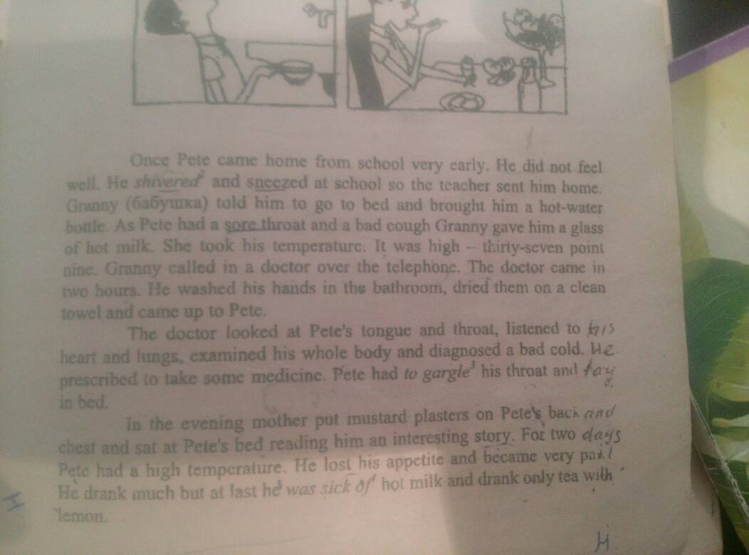 После Пит вернулся домой из школы очень рано. Он сделал не чувствуют себя хорошо. Он дрожали чихнул в школе, поэтому учитель отправил его домой. Бабушка сказала ему, чтобы лечь в постель и принес ему грелку. Как Пит имел боль в горле и кашель плохо. Бабушка дал ему стакан горячего молока. Она взяла его температуру. Это был высокий - тридцать семь точка девять. Бабушка называется врача по телефону. Доктор пришел в два часа. Он вымыл его руки в ванной комнате, просушить их на чистое полотенце и подошел к Пит. Доктор посмотрел на Пита языка и горла, слушал его сердце и легкие, рассмотренывсе его тело и диагноз сильный насморк. Он предписано принять некоторые лекарства.Пит для gargled его горло и оставаться в постели. Вечером мать положить горчица штукатурка. Питерс, спине и груди и сидел на кровати Пит, читая его интересную историю. За два дня Пит был высокийТемпература. Он потерял свой аппетит и стал очень бледно. Он выпил много но наконецОн был болен горячего молока и пил только чай с лимоном.