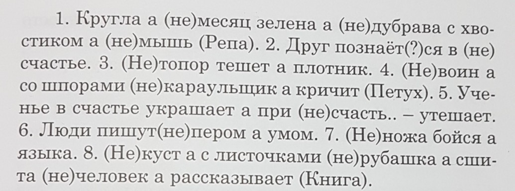 1.Круглая, а не месяц, зелена, а не дубрава, с хвостиком, а не мышь (Репа).2.Друг познается в несчастье.3. Не топор тешет, а плотник. 4. Не воин, а со шпорами, не караульщик, а кричит (Петух). 5. Ученье в счастье украшает, а при несчастье - утешает. 6. Люди пишут не пером, а умом. 7. Не ножа бойся, а языка. 8. Не куст, а листочками, не рубашка, а сшита, не человек, а рассказывает (Книга).