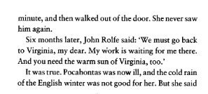 Она больше не видела его. Шесть месяцев спустя Джон Ролф сказал: «Мы должны вернуться в Вирджинию, моя дорогая. Моя работа ждет меня там. И тебе тоже нужно теплое солнце Вирджинии. Это было правдой. Покахонтас заболел, и холодый дождь английской зимы не был для нее хорош.