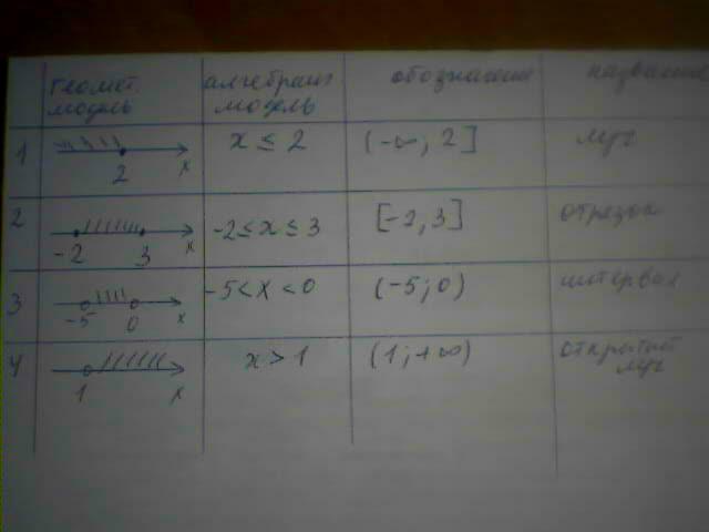 4))Геометрическая модель ? Аналитическая модель х больше чем 1 Обозначение промежутка?Название промежутка ?