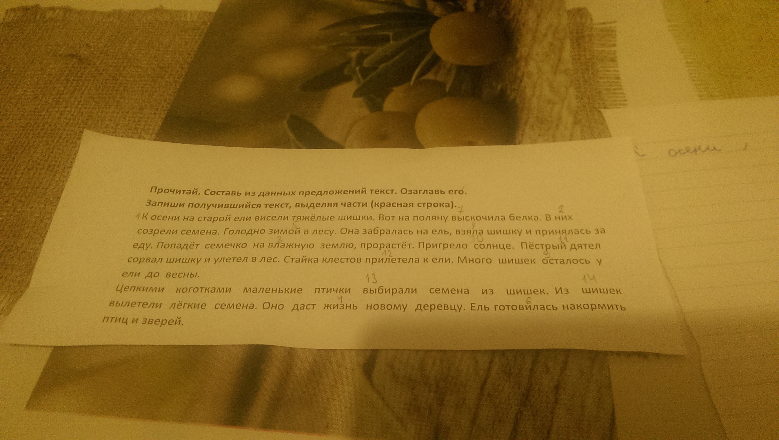Голодно зимой в лесу.Ель готовилась накормить птиц и зверей. К осени на старой ели висели тяжелые шишки.В них созрели семена.Стайка клестов прилетела к ели.Цепкими коготками маленькие птички выбирали семена из шишек.Из шишек вылетели семена.Попадет семечко на землю, прорастет.Оно даст жизнь новому деревцу.Пёстрый дятел сорвал шишку и улетел в лес.Пригрело солнце.Вот на поляну выскочила белка.Она забралась на ель,взяла шишку и принялась за еду.Много шишек осталось у ели до весны.