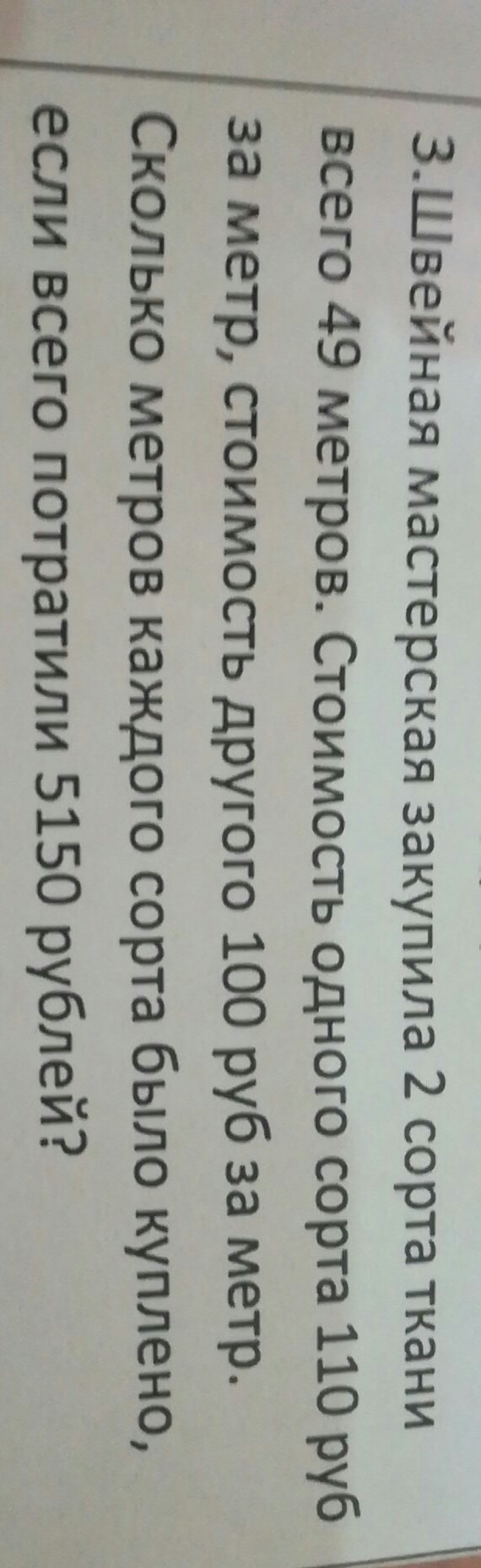 Ответ: первого сорта ткани было куплено 25 метров, второго 24 метра.