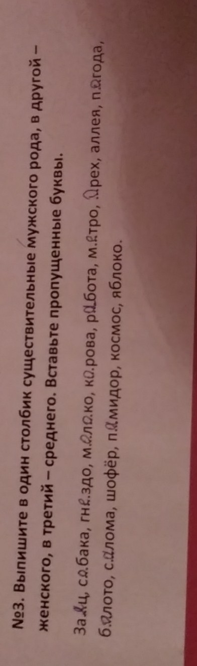 М/р: зая,орех,шофер,помидор,космос. Ж/р: собака,корова,работа,аллея,погода,солома. С/р: гнездо,молоко,метро, болото, яблоко