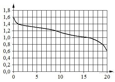 При работе фонарика батарейка постепенно разряжается и напряжение в электрической цепи фонарика падает. На графике показана зависимость напряжения в цепи от времени работы фонарика. На горизонтальной оси отмечено время работы фонарика в часах, на вертикальной оси — напряжение в вольтах. Определите по графику, за сколько часов работы фонарика напряжение упадёт с 1,2 В до 0,8 В.