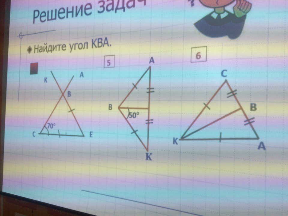 треугольник КВА-равнобедренный Линия которая внутри треугольника-биссектриса и медиана и высота Значит угол КВА=50*2=100