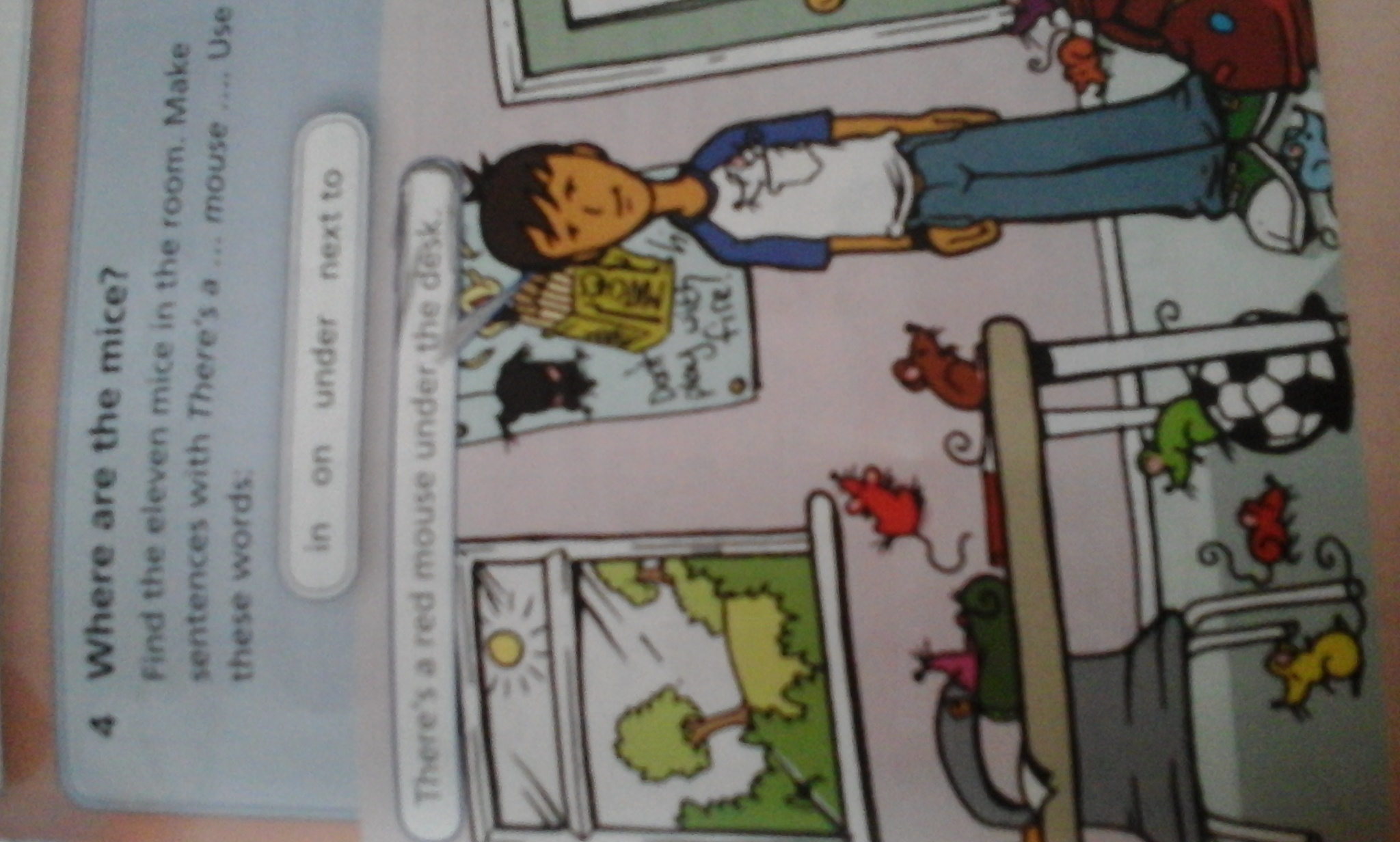 There's are ten mice in a room. There's are three mice on the table. There's are three mice under the table. There's are two mice next to boy.