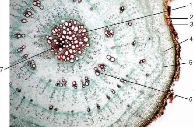 На фото представлен поперечный срез некоторого осевого органа покрытосеменного растения. Соотнесите подписанные цифрами ткани с их названием.