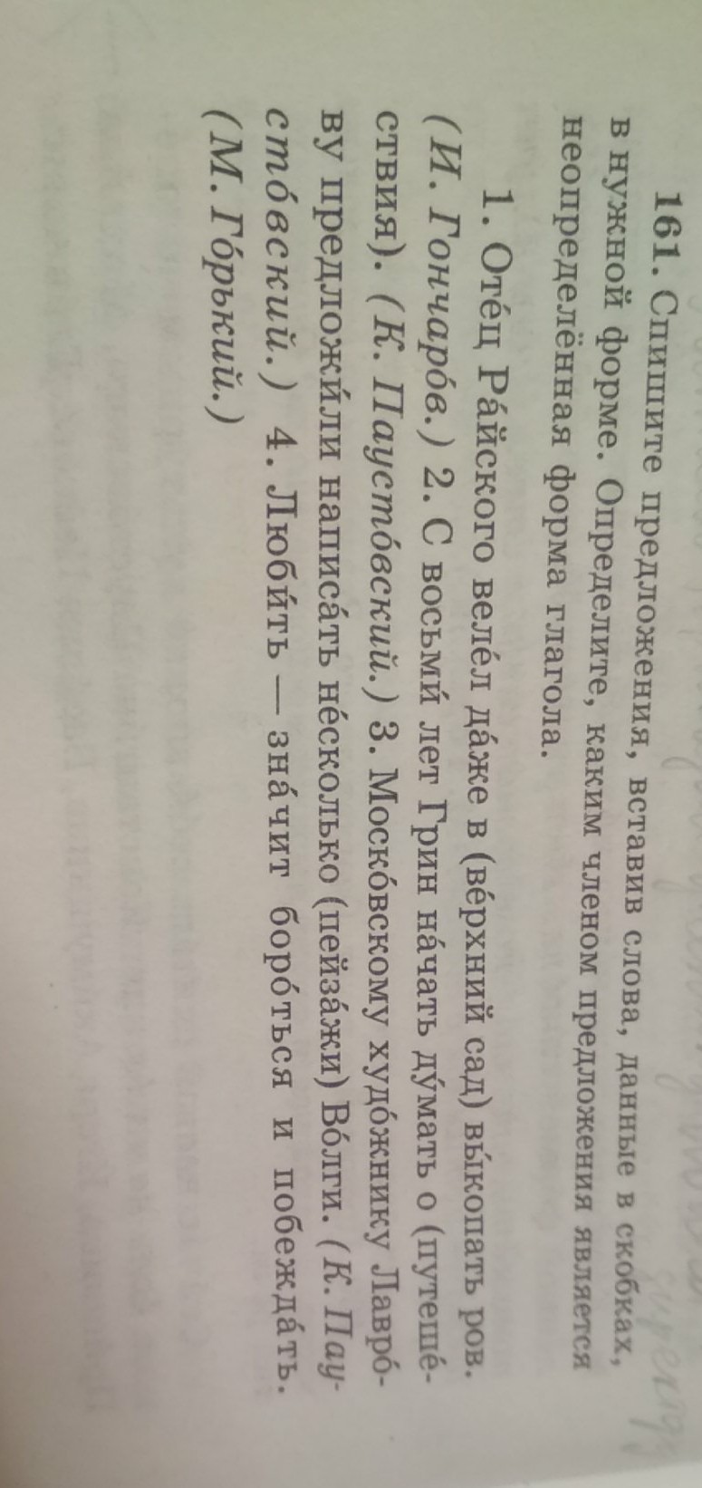 помогите)) упр161 спишите предложения вставив слова данные в скобках в нужной форме. Определите каким членом предложения является неопределенная форма глагола.