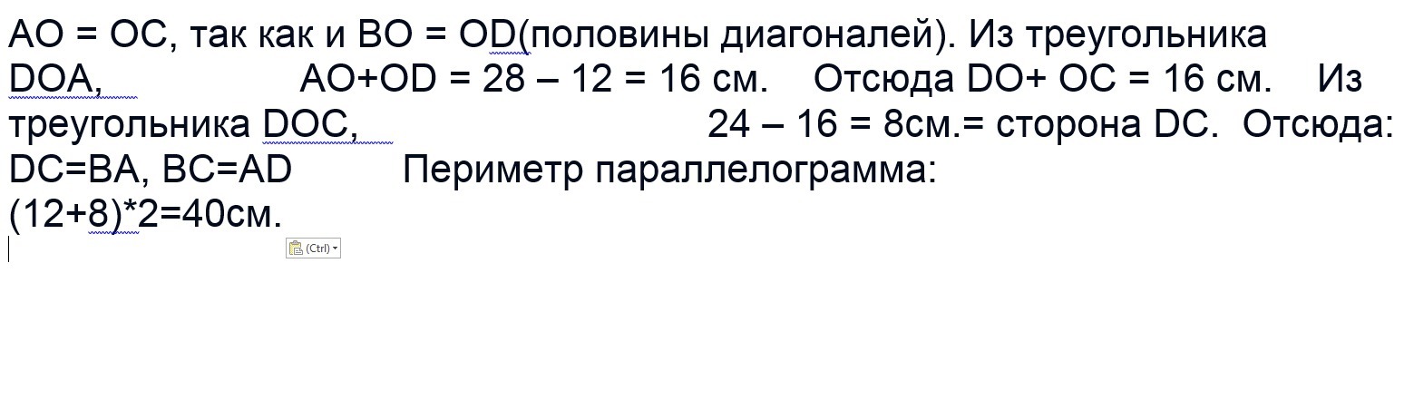 Дано: ABCD - параллелограмм, О - точка пересечения диагоналей, BC - 12 см, периметр треугольника COD - 24 см, периметр треугольника AOD - 28 см. Найдите периметр параллелограмма ABCD.