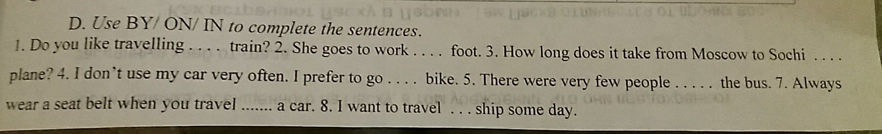 1)by 2)on 3)by 4)by 5) in 7)by 8) by (до этого написала в комментариях)