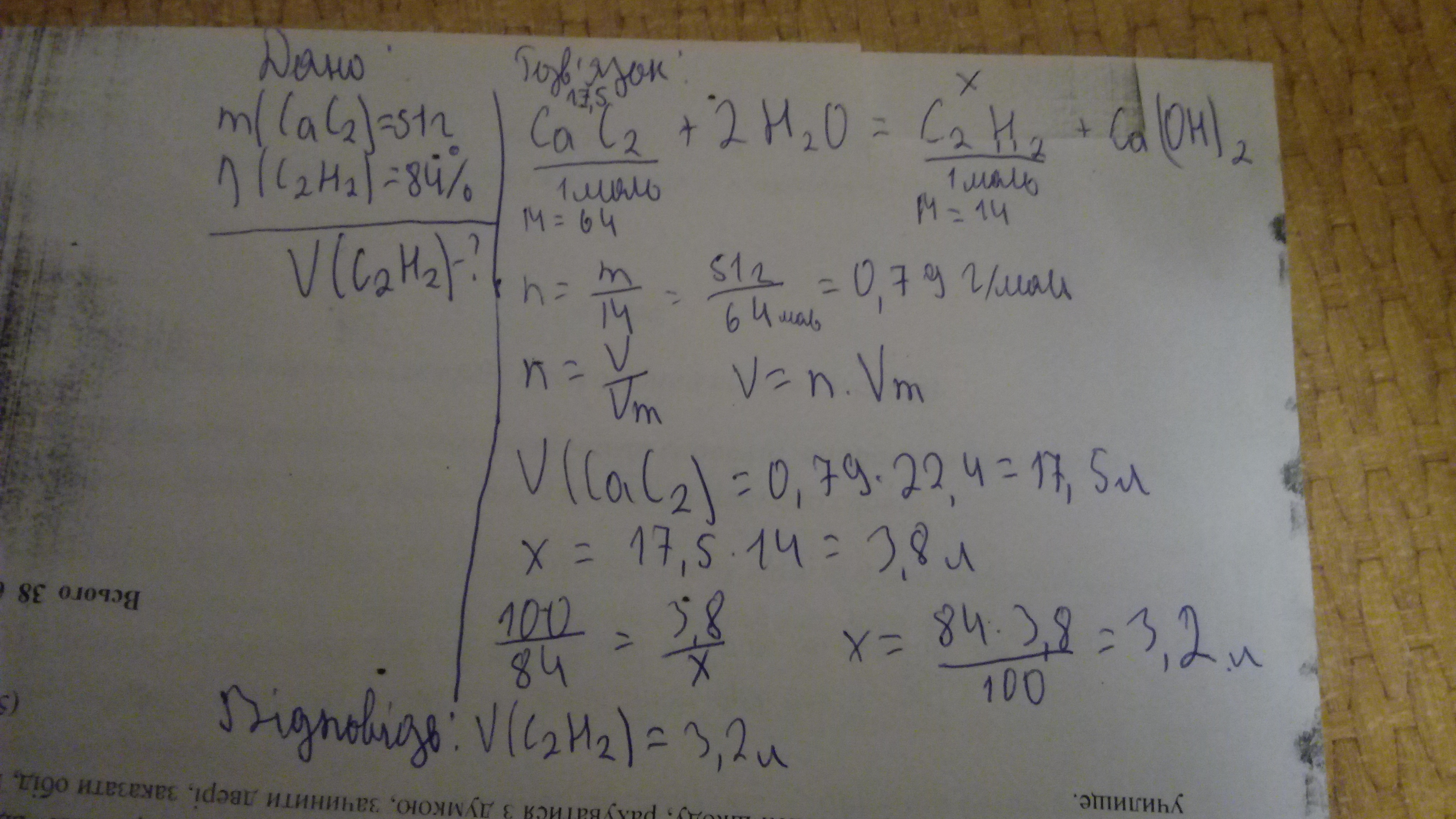 Найти объем ацетилена при нормальных условиях, который получают из карбида кальция массой 51 гр, если выход состовляет 84%