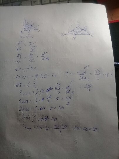 В треугольнике ABC стороны AB = 10, AC = 24, BC = 26. В треугольнике проведены медианы AM и CN, M и N -- середины сторон BC и AB -- соответственно. Точка I лежит на стороне AC, при этом BI — биссектриса. Найдите площадь треугольника MNI