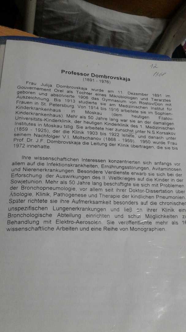 Госпожа Юлия Домбровская родилась 11 декабря 1891 года в Орловской губернии в семье микробиолога-ветеринарного врача и в 1906 году закончила гимназию в Ростове-на-Дону с отличием. До 1913 году она училась в Женском медицинском институте Санкт-Петербурга. С 1914 по 1916 год работала в Софийской детской больнице в Москве (нынешний Филатовской детской больнице).Более чем 50 лет она работала в тогдашней Университетской детской клинике,нынешней Детской клинике при первом меде в Москве. Здесь она работала первоначально под руководством Н.С. Корсакова (1859-1925),который возглавлял клинику с 1903 по 1922 год,а затем под руководством его последователя -- В.И. Молчанова (1868-1959). В 1950 году профессор,доктор наук,Ю.Ф. Домбровская возглавила клинику и находилась на этом посту вплоть до 1972 года.