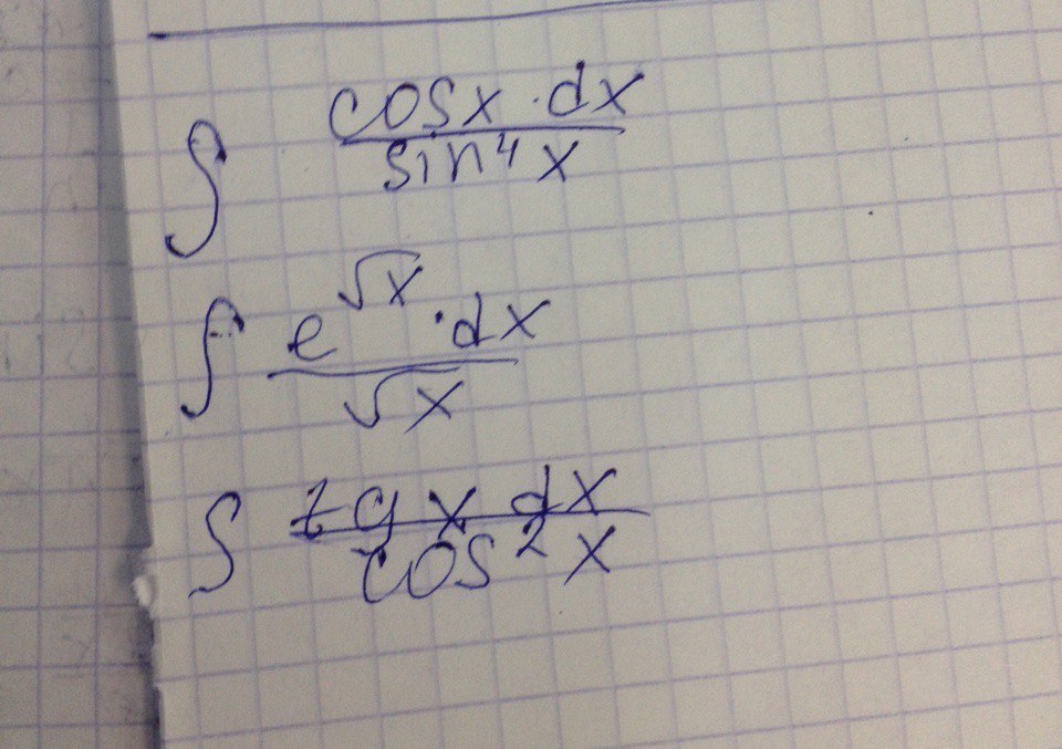1); ; int  frac{cosx, dx}{sin^4x}=int (sinx)^{-4}cdot underbrace {cosx, dx}_{d(sinx)}=frac{(sinx)^{-3}}{-3}+C=- frac{1}{3sin^3x}  +C\\\2); ; int  frac{e^{sqrt{x}}, dx}{sqrt{x}}=2cdot  int e^{sqrt{x}}cdot underbrace {frac{dx}{2sqrt{x}}}_{d(sqrt{x})}=2cdot e^{sqrt{x}}+C\\\3); ; int  frac{tgx, dx}{cos^2x} =int tgxcdot underbrace {frac{dx}{cos^2x}}_{d(tgx)} = frac{tg^2x}{2}+C