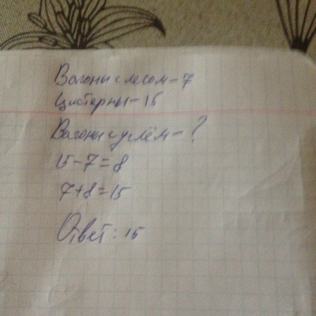 В товарном составе много вагонов:цистерны,вагоны с лесом и вагоны с углём.Вагонов с лесом 7,цистерны 15,а вагонов с углём на столько же больше,чем вагонов с лесом,на сколько меньше чем цистерн.Сколько в этом составе вагонов с углём?