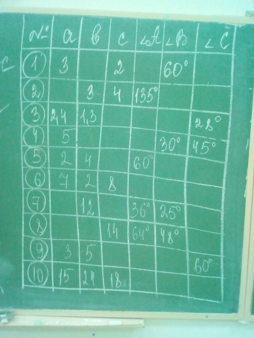 Помогите решить задачу номер 10 там нужно найти то что пропущено по теоремам синуса или косинуса .Я нашла что соs A = 675/64 =10,5468 , а как дальше найти угол А ?
