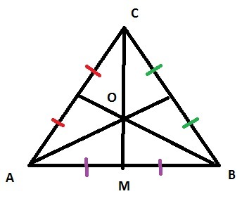 В Δ проведены 3 медианы, по свойству медиан в Δ знаем, что медиана в точке пересечения делится в соотношении 2:1, считая от вершины, значит ОМ=СМ:3 ОМ=15:3=5см МВ=1/2АВ=10/2=5 см, так как СМ-медиана.