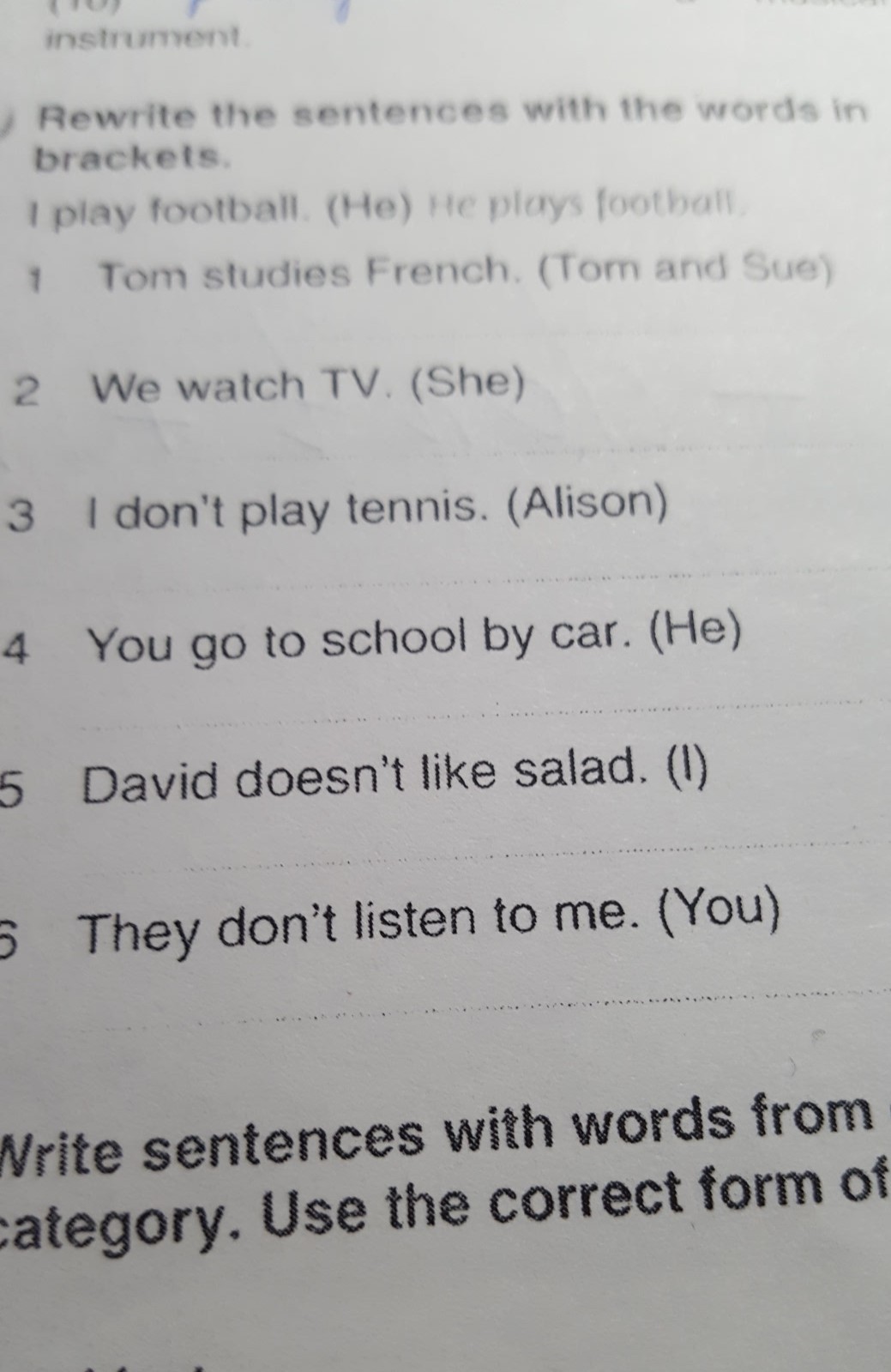 tom and sue studies French.She watches TV.Alison dont plays tennis.He goes to school by car.I doesnt like salad.You doesnt listen to me.