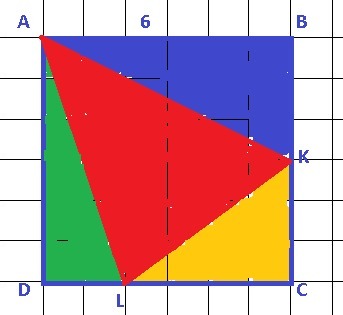 В квадрате ABCD: АВ = 6 см, К – середина стороны ВС, а L – точка на стороне CD, причём CL = 2LD. Найдите площадь треугольника AKL.