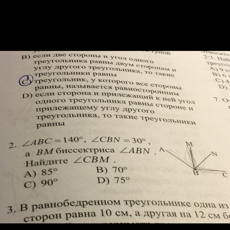 ответ D.т.к угол аbс = 140 ,а угол сbn = 30,то угол abn= 140-30=110,bm биссектриса угла abn ,то угол mbn=mba=110:2=55,угол cbm=55+30=75
