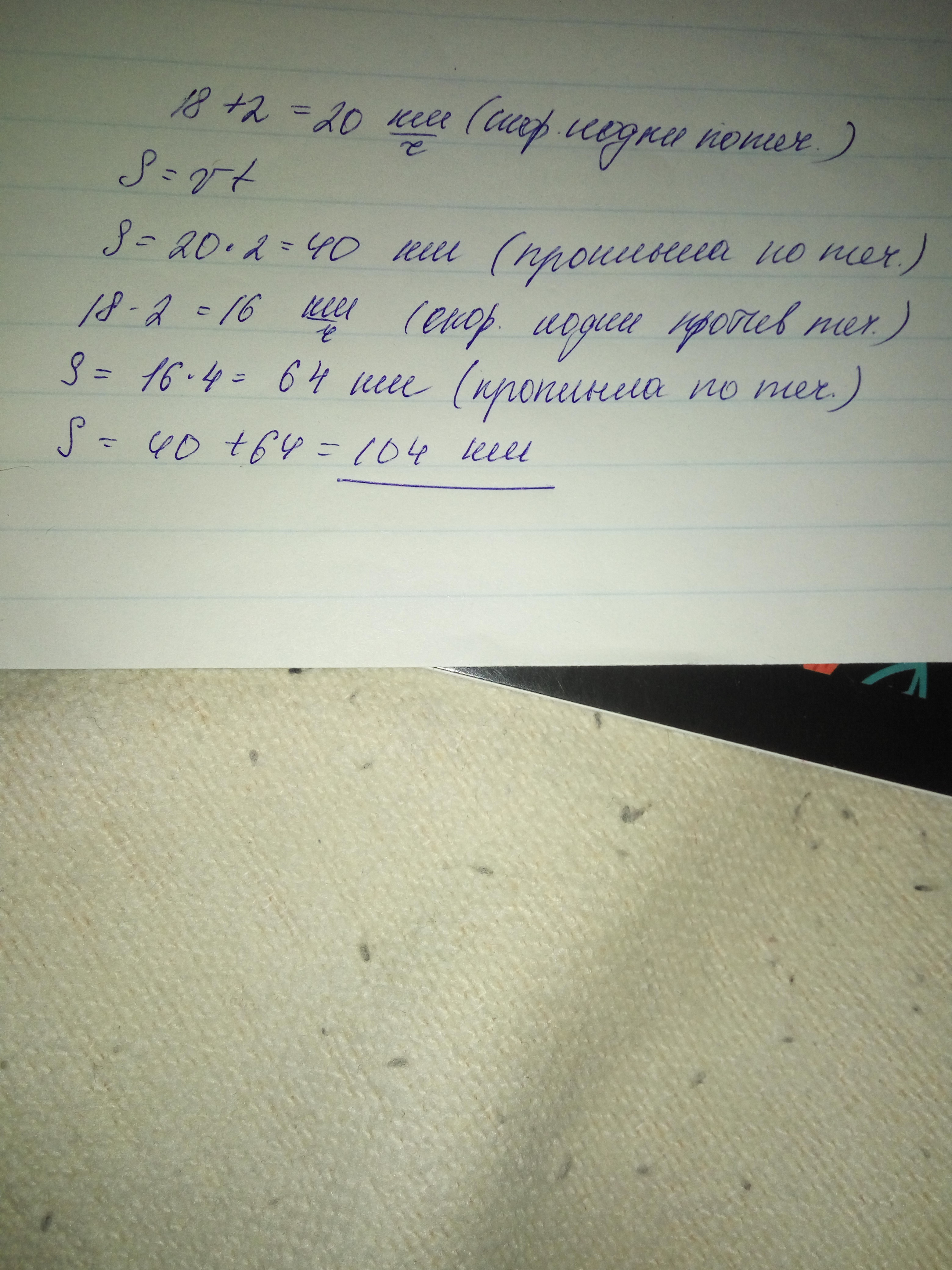 Собственная скорость лодки 18 км/ч ,скорость течения реки 2 кмч . Какое расстояние проплыла лодка ,если 2 ч она плыла по течению реки и 4 ч -против течения ?