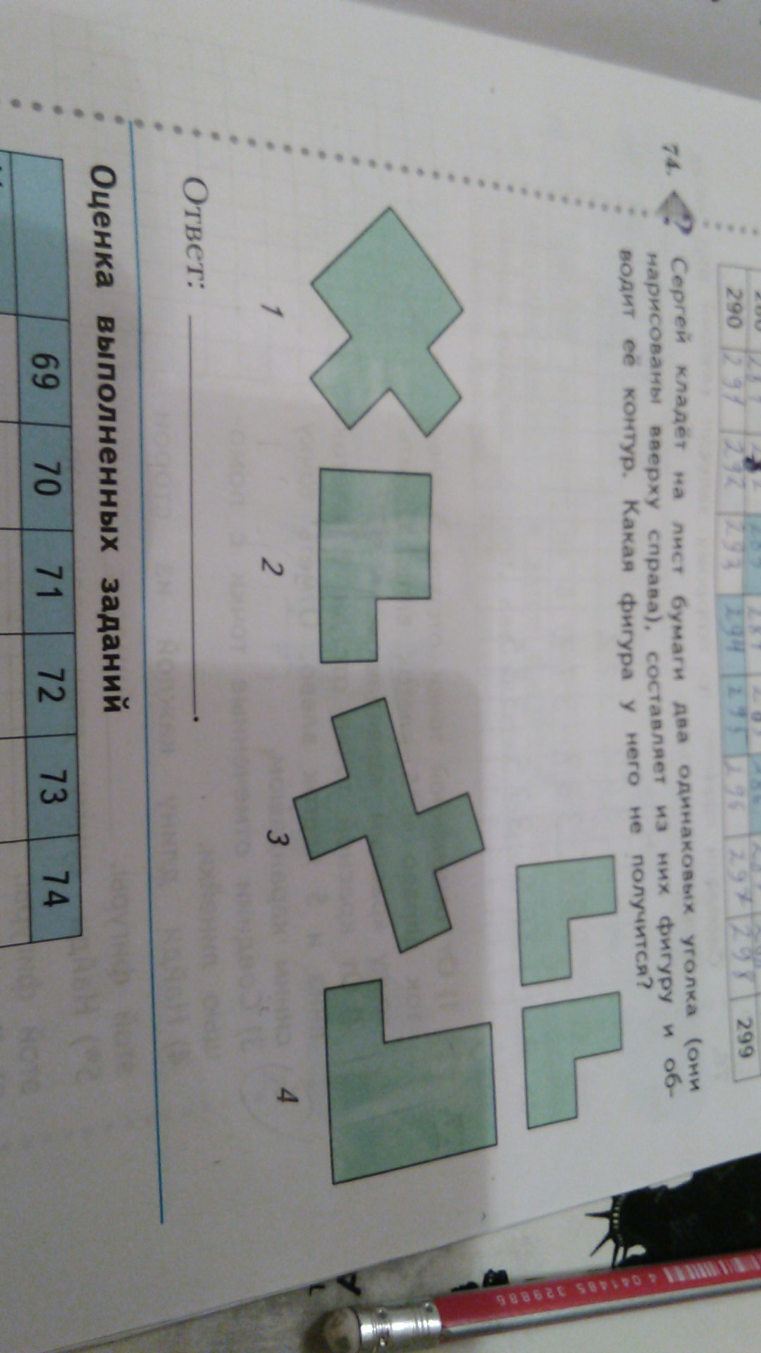 Сергей кладёт на лист бумаги два одинаковых уголка ( они нарисованы вверху справа), составляет из них фигуру и обводит её контур. Какая фигура у него НЕ получится? МАТЕМАТИКА: ДРУЖИМ С МАТЕМАТИКОЙ СТРАНИЦА 31 N 74