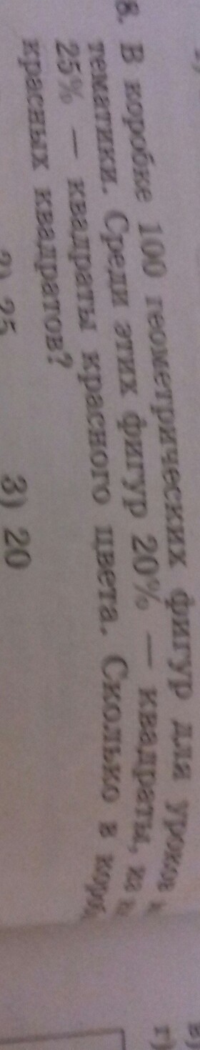в коробке было 100 геометрических фигур для уроков математики среди этих фигур 20% квадратный из 25% в квадрате красного цвета Сколько в коробке красных квадратов