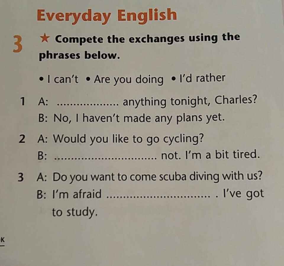 1 а Are you doing 2 b i'd rather 3 b i can't