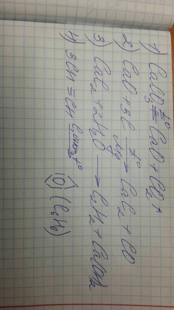 Кальций карбонат → кальций оксид → кальций карбид → ацетилен → бензол.