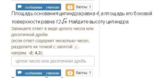 { S бок = 12√π. ⇔{ 2πrH = 12√π. ⇔{ 2π*2/√π* H = 12√π.⇒ H =3.