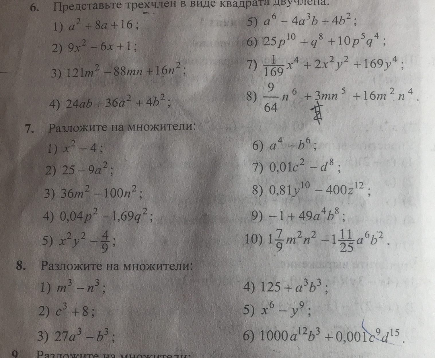 1(7/9)m^2n^2-1(11/25)a^6b^2=)3/4ab-6/5a^3b)(3/a4ab+6/5^3b);