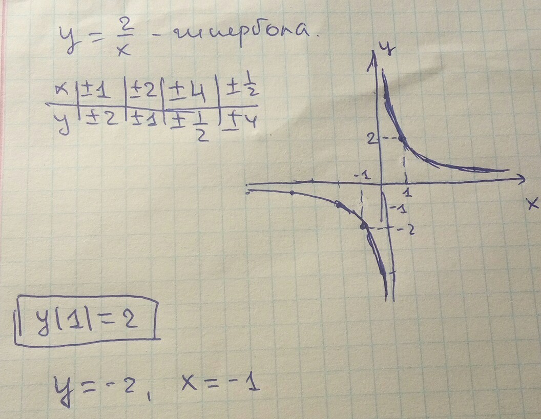 Построй график функции y=2:x. С помощью графика выясни значение y при x=1 и значение x, если y=-2