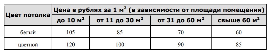 Если по условию площадь потолка 40 м², то, исходя из таблицы, цена за 1 м² цветного потолка будет 90 руб.