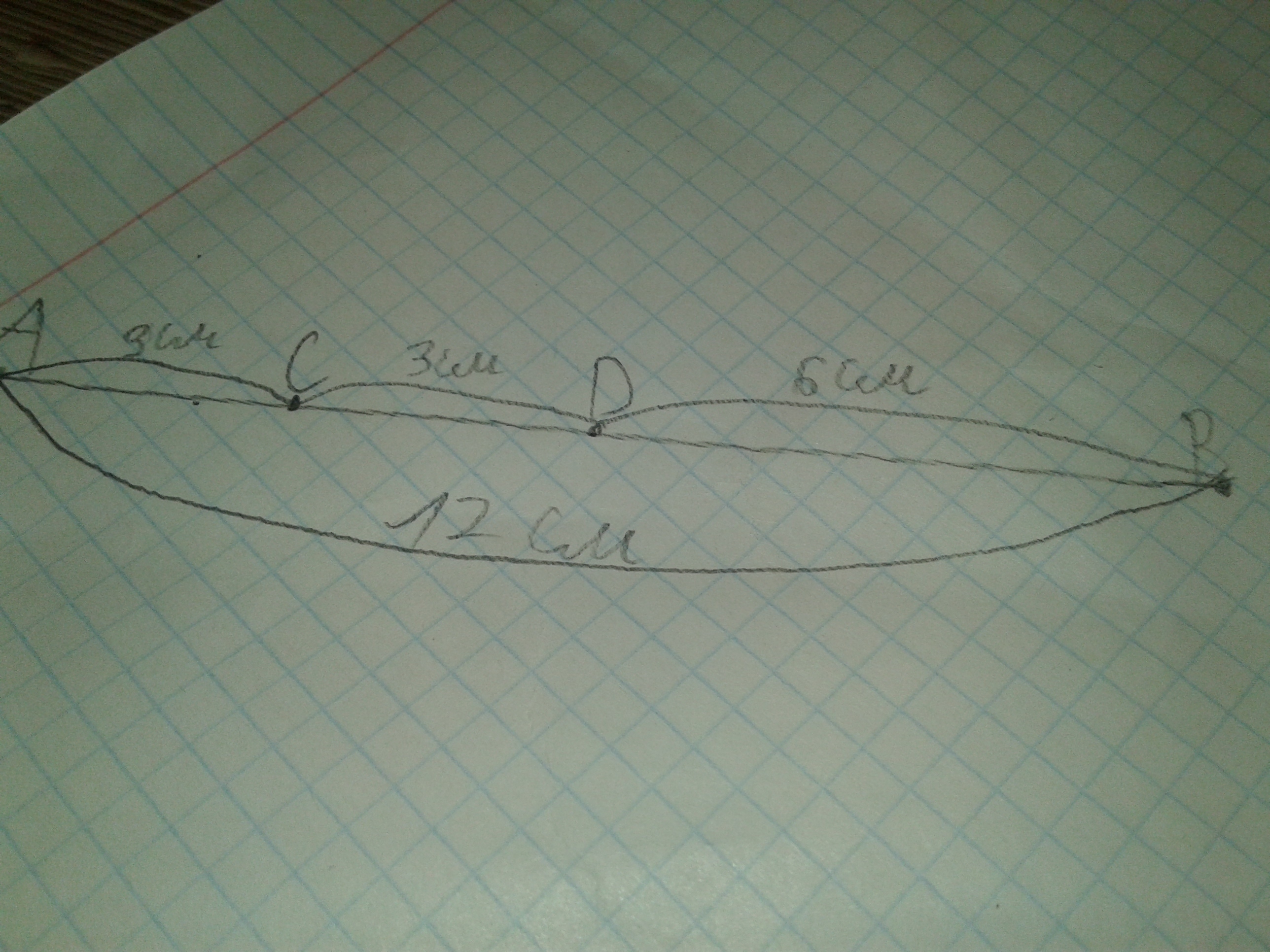 Начерти отрезок AB длиной 12 см отметьте на нём точки C и D так чтобы отрезок AC был в два раза короче отрезка AB и в два раза длиннее отрезка db