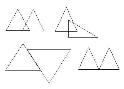 нарисуй два треугольника так, чтобы их общей частью был треугольник, четырехугольник, отрезок, точка.